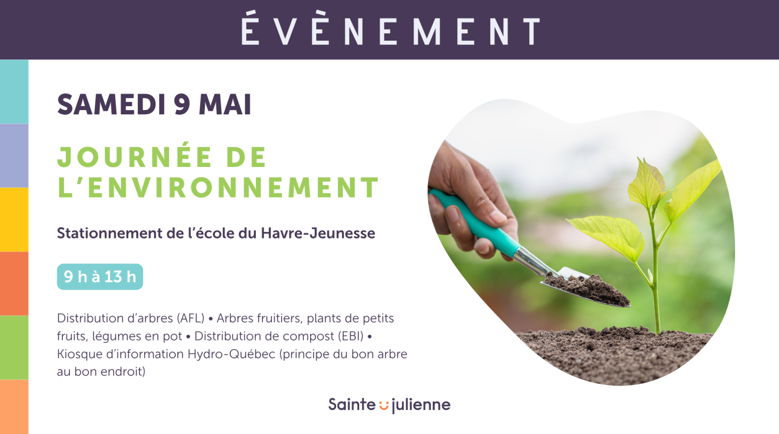 Le samedi 9 mai 2026, de 9 h à 13 h, la Municipalité de Sainte-Julienne tiendra sa Journée de l’environnement dans les stationnements de l’école secondaire Havre-Jeunesse.