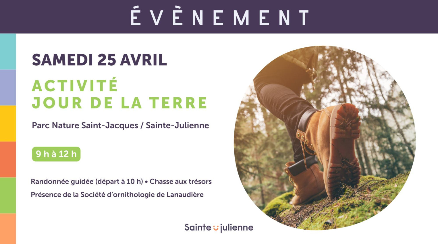 Sainte-Julienne emboîte le pas à ce vaste mouvement planétaire depuis plusieurs années et souligne les efforts quotidiens des juliennois visant à réduire leur empreinte écologique. À l’occasion du Jour de la Terre, la Municipalité de Sainte-Julienne invite la population à participer à une activité familiale au Parc Nature.